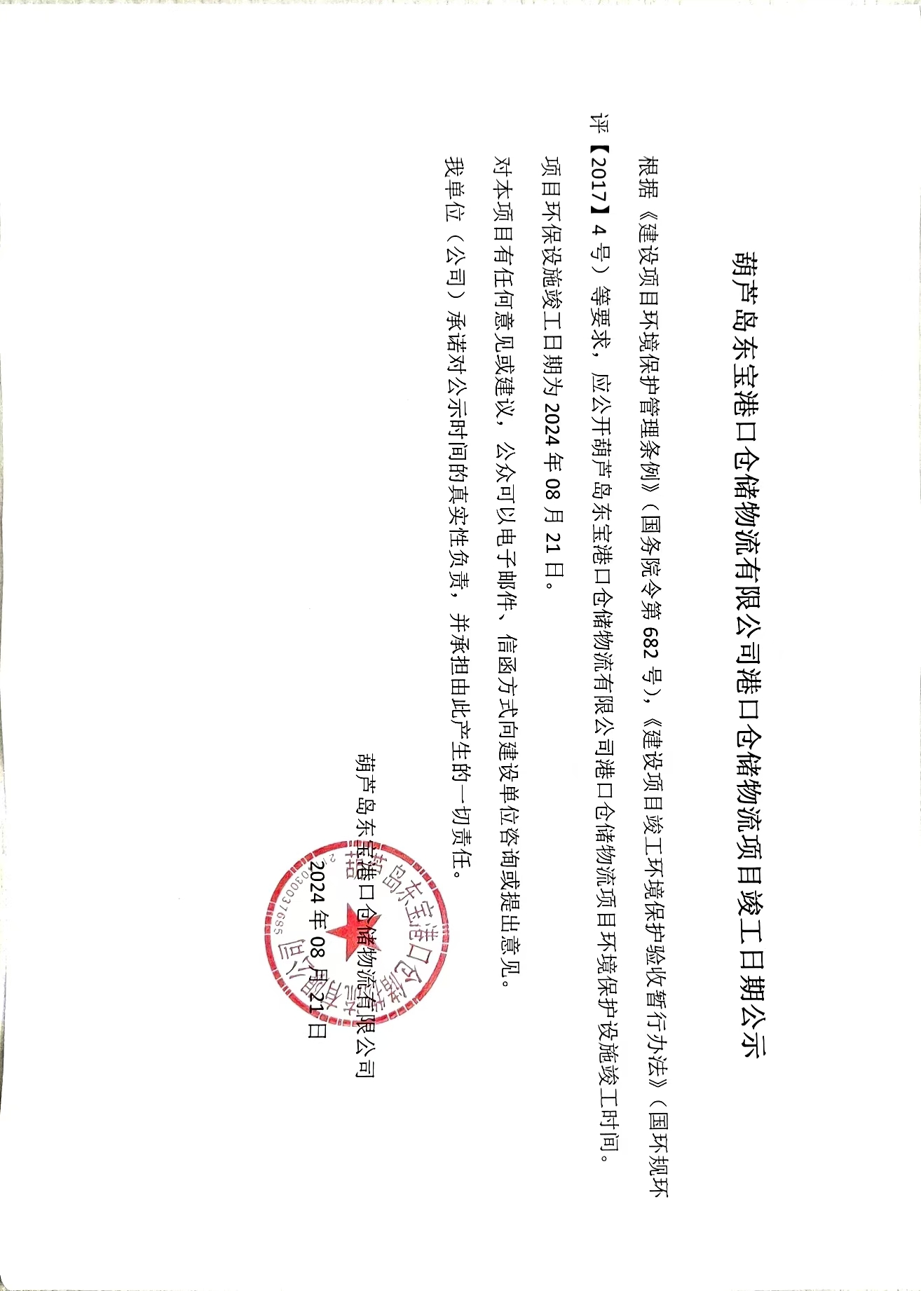 葫蘆島東寶港口倉儲物流有限公司港口倉儲物流項目竣工日期公示