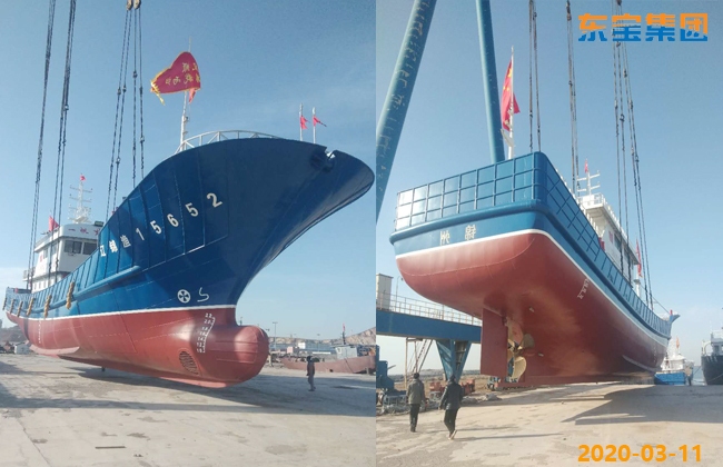 今日,在遼寧東寶集團船舶制造有限公司碼頭,一艘新建38米漁船順利安全下水。 Today, a new 38-meter fishing boat was launched safely at the port of liaoning dongbao shipbuilding co. LTD. 該漁船船長38米,適航遠海航區(qū)。該系列船為鋼質(zhì)、雙甲板、柴油機動力、單機單漿單舵的船型。主要用于太平洋公海捕魚作業(yè),超低溫速凍保鮮魚貨供應市場。