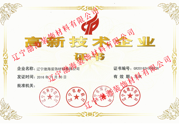 遼寧渤海裝飾材料有限公司《高新技術企業(yè)》證書